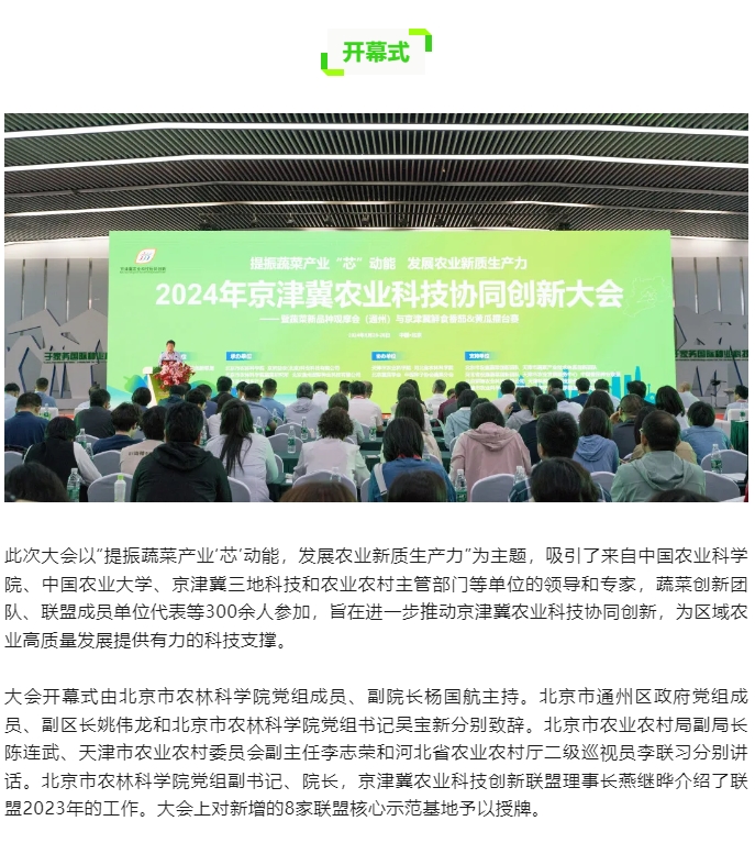 單位承辦的2024年京津冀農業科技協同創新大會暨蔬菜新品種觀摩會盛大開幕。